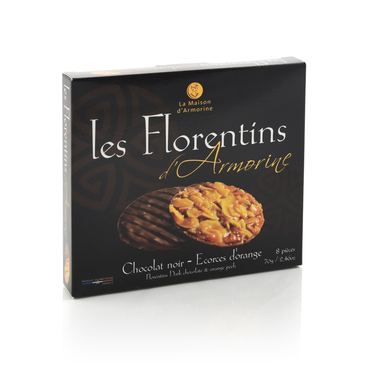 Nos florentins sont nappés de chocolat noir et contiennent des écorces d’orange qui apportent une touche acidulée.