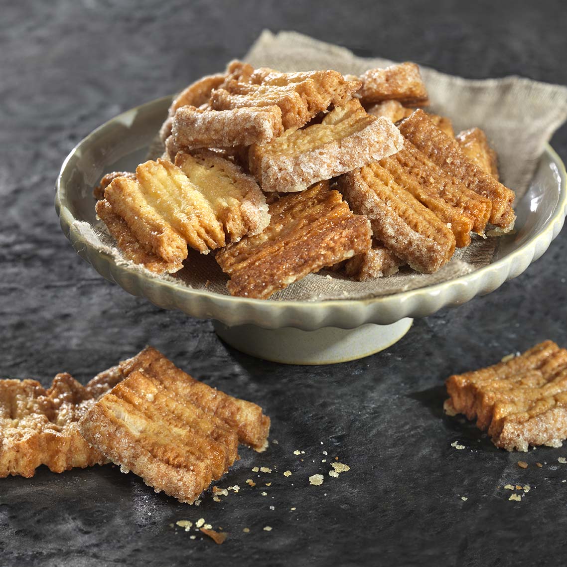Des petits biscuits de pâte feuilletée caramélisée qui ressemblent aux traditionnels palmiers ainsi qu’au Kouign-Amann.