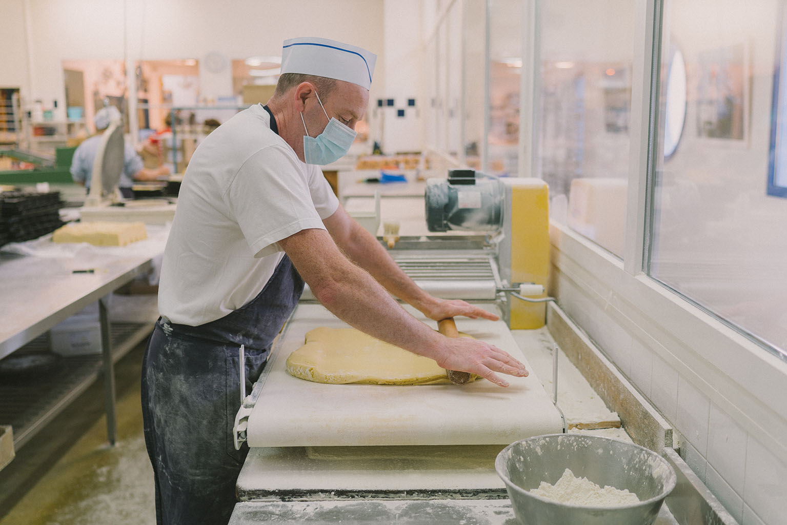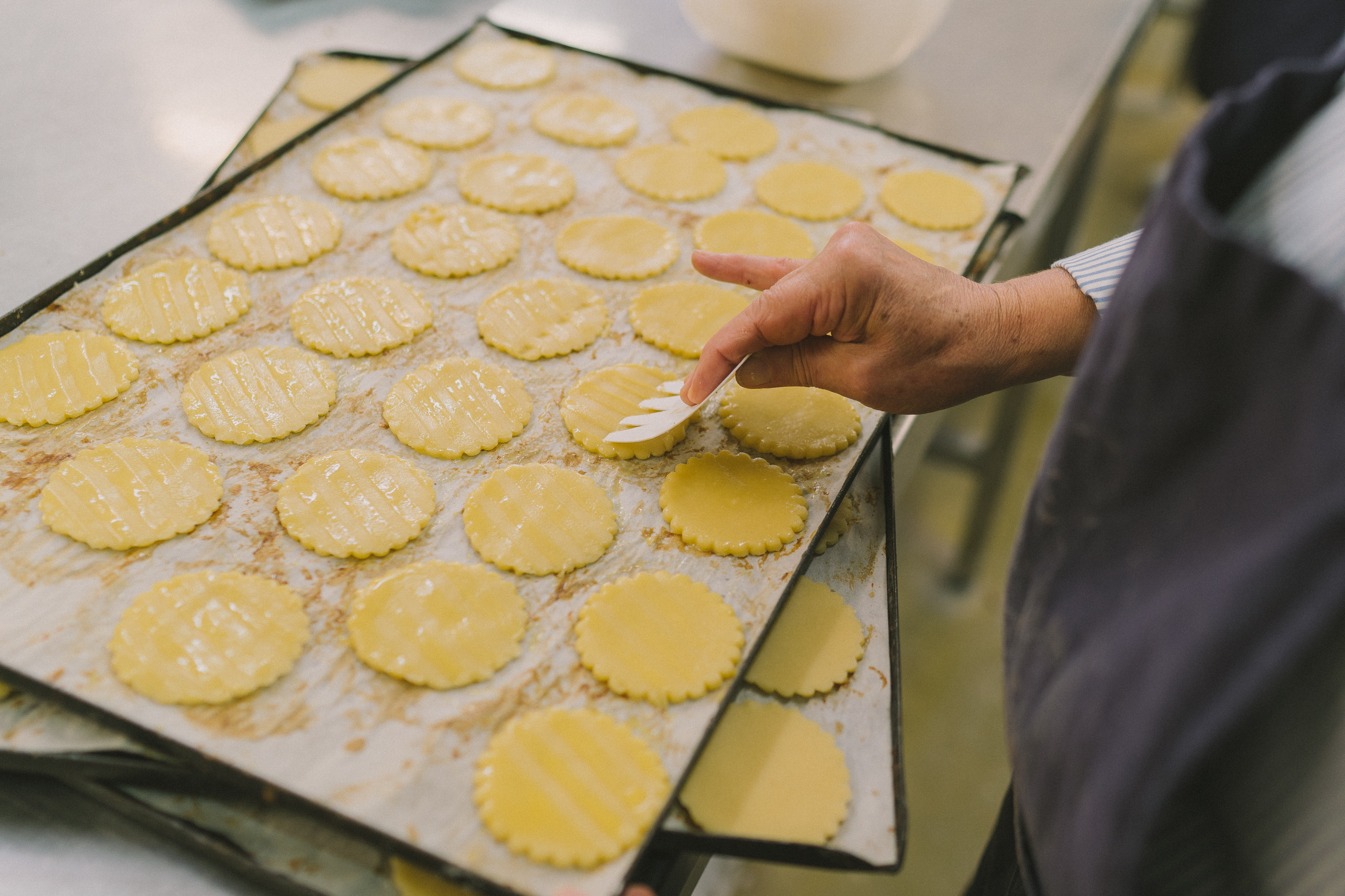 Il dépose la farine sur la pâte pour éviter qu’elle ne colle, ensuite il détaille les galettes à l’aide d’un emporte-pièce.