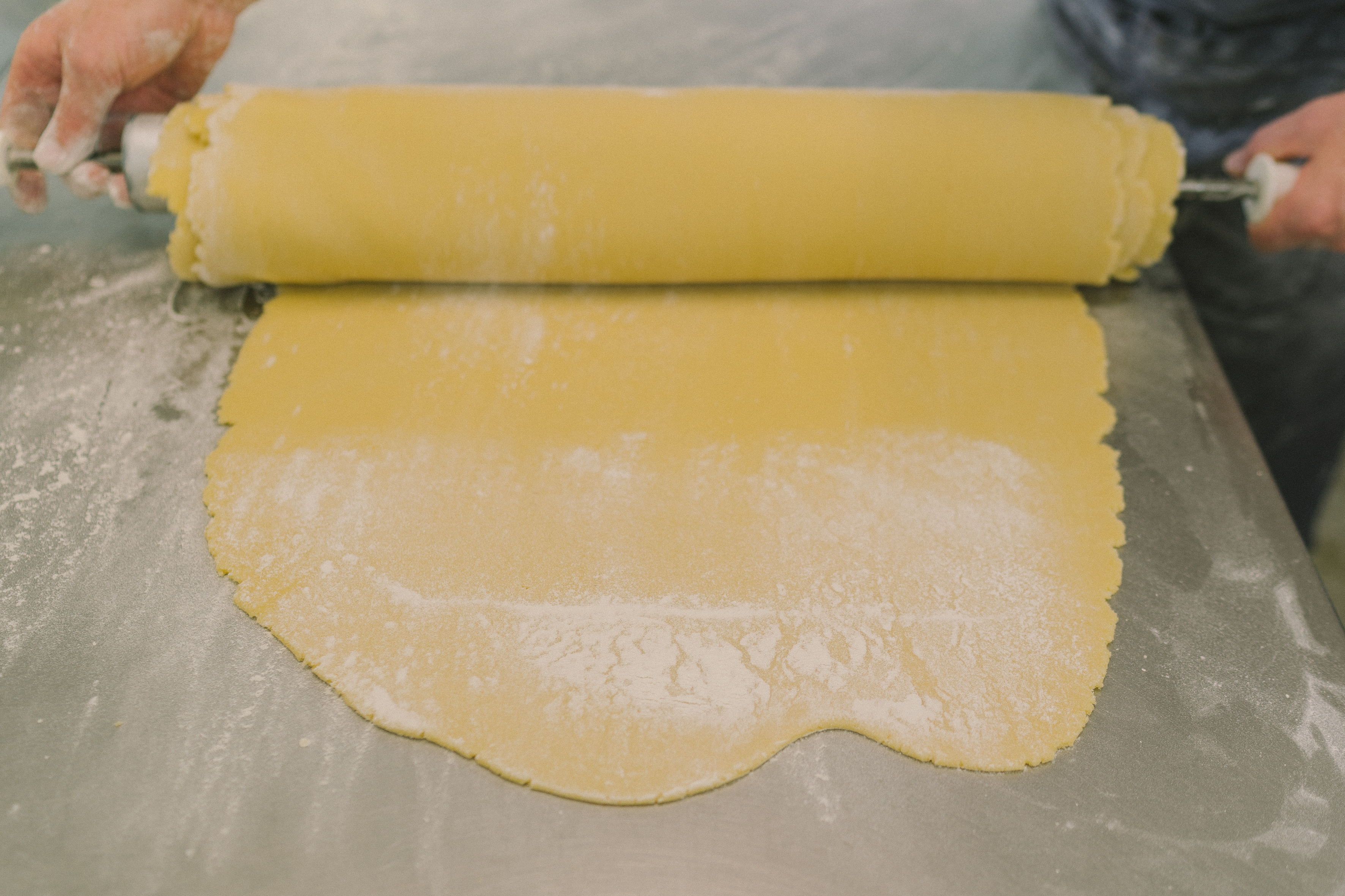 En premier le pâtissier pétri la pâte à la main puis l’étale à l’aide du laminoir. Le laminoir est un gros rouleau à pâtisserie qui sert à étaler la pâte pour l’amincir jusqu’à l’épaisseur voulue. On obtient alors une bande de pâte d’1m50 environ. La pâte est enroulée autour d’un rouleau à pâtisserie pour éviter qu’elle ne se casse.