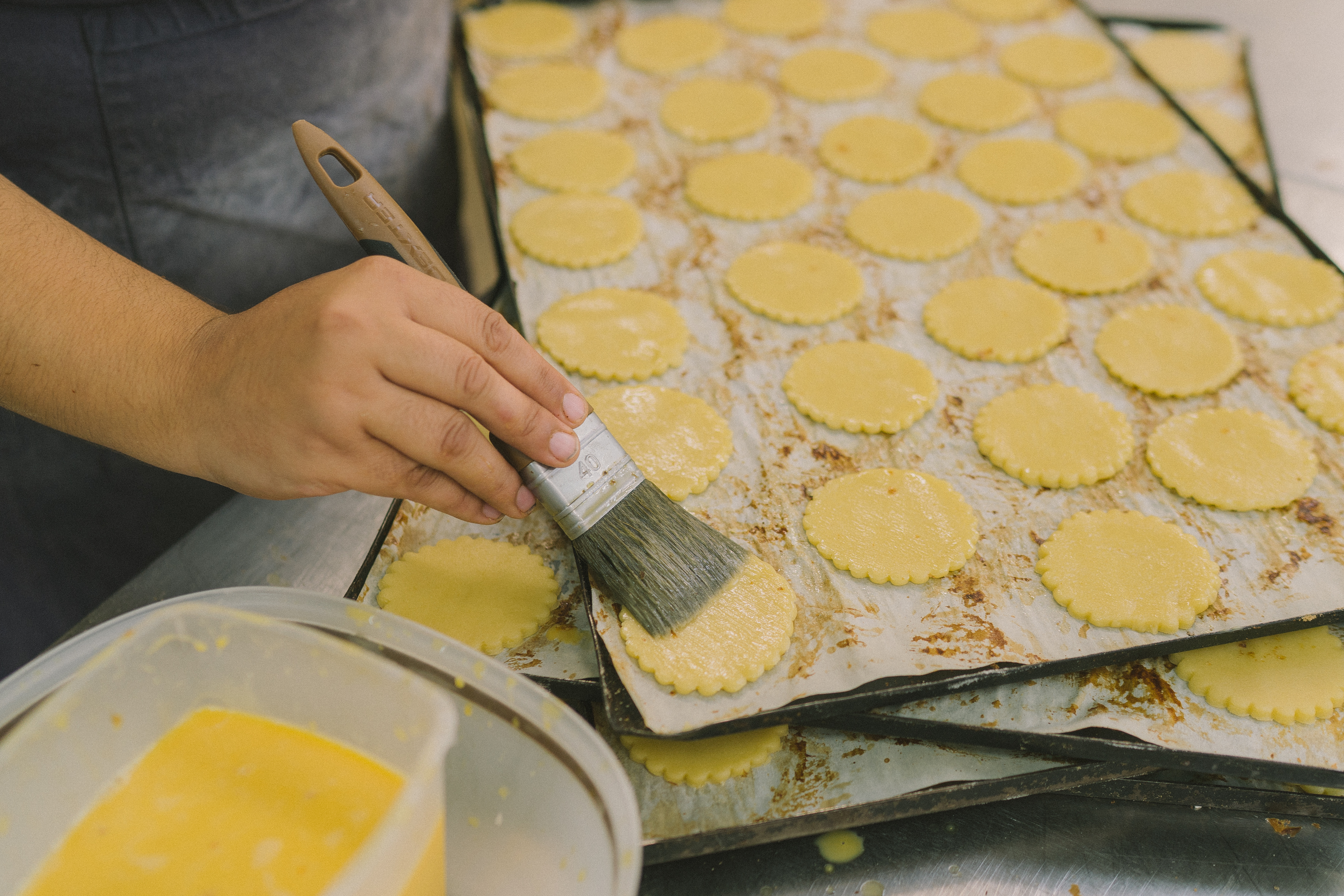 Une fois les galettes formées, on les dispose sur les plaques de cuisson recouvertes de papier sulfurisé. À l’aide d’un pinceau, nous dorons les galettes au jaune d’œuf : c’est ainsi que l’on obtient une belle couleur à la cuisson.
