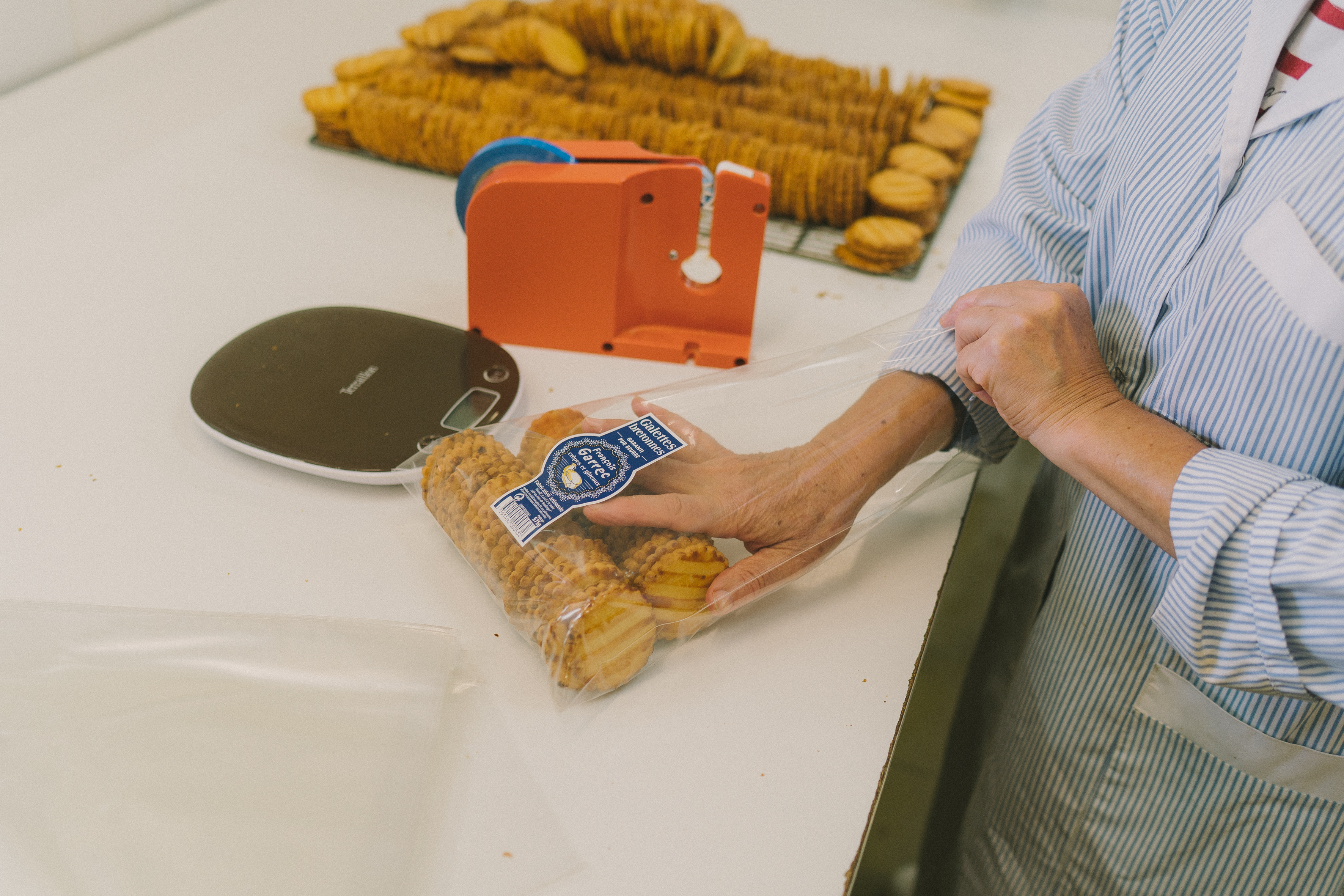 Une fois cuites et sorties du four, on laisse les galettes refroidir, et quand elles sont bien froides… Elles sont soigneusement glissées à la main dans leur sachet, qui est pesé avant d’être fermé.
